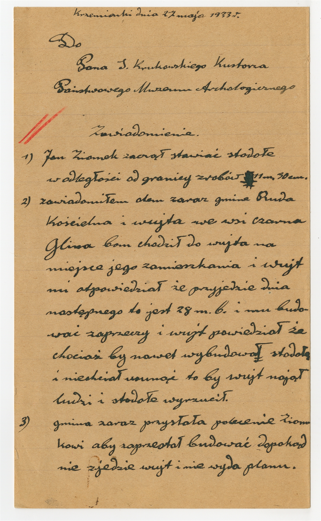 Rękopis - list od A. Gromka do prof. Stefana Krukowskiego Krzemionki 27 V 1933 r. - "1) Jan Ziomek zaczął stawiać…"