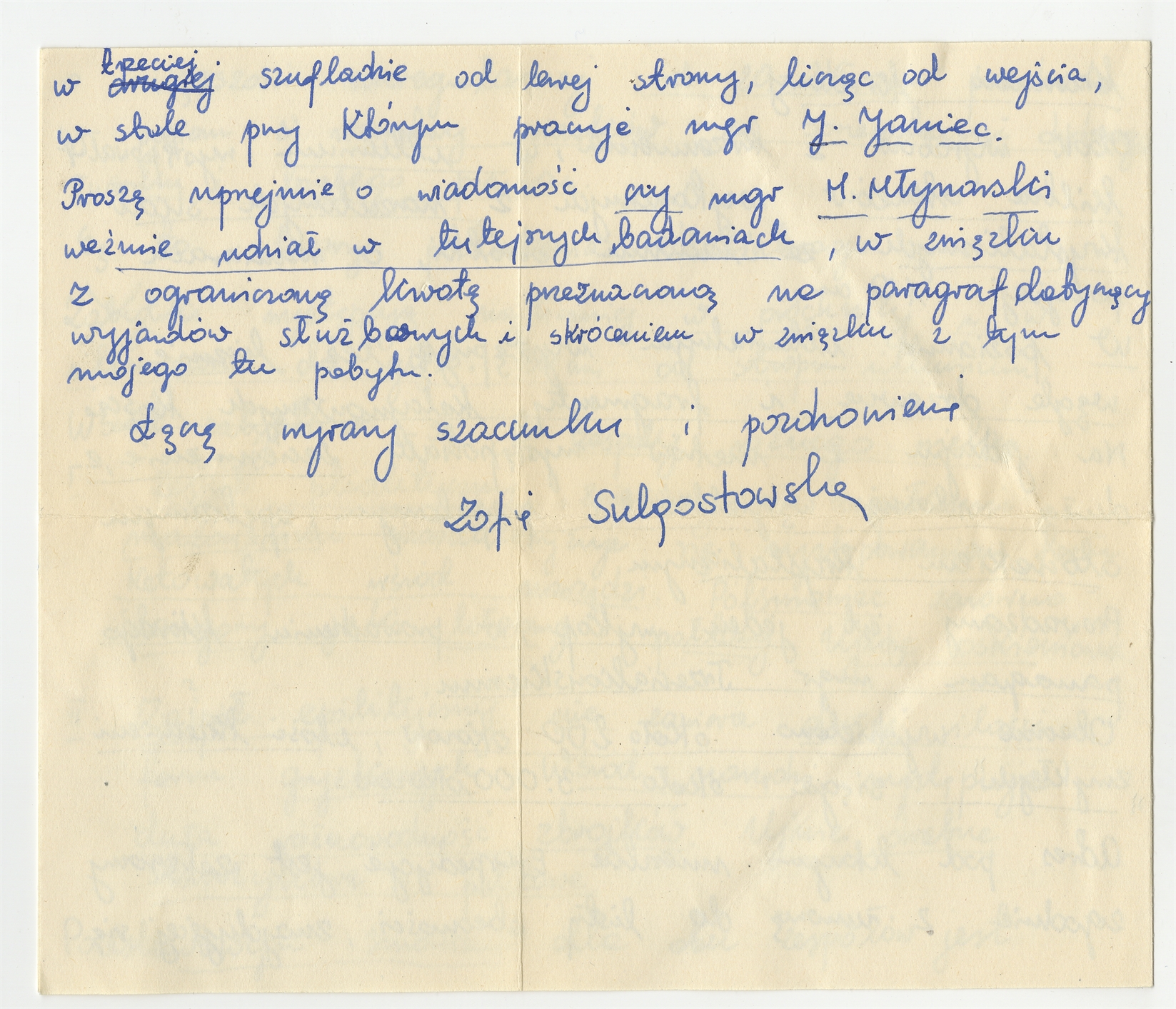 Rękopis – list od Zofii Sulgostowskiej do profesora Stefana Krukowskiego informujący o postępach w pracach wykopaliskowych. Ełk 16 lipca 1970 r. str. 4: „w trzeciej szufladzie od lewej strony (...)”