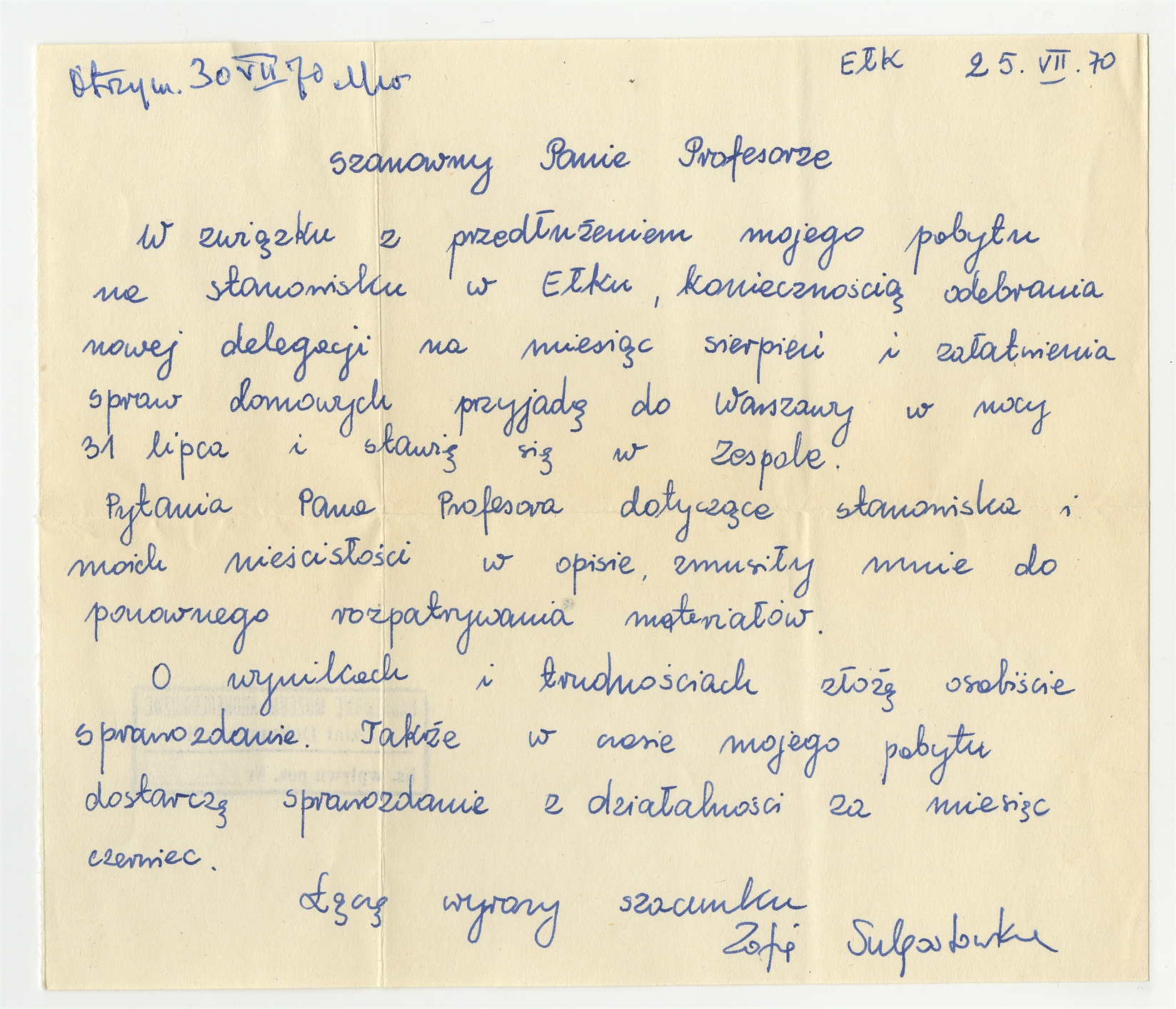 Rękopis – list od Zofii Sulgostowskiej do profesora Stefana Krukowskiego informujący o postępach w pracach wykopaliskowych. Ełk 25 lipca 1970 r. str. 1: „Szanowny Panie Profesorze w związku z przedłużeniem mojego pobytu na stanowisku w Ełku (...)”