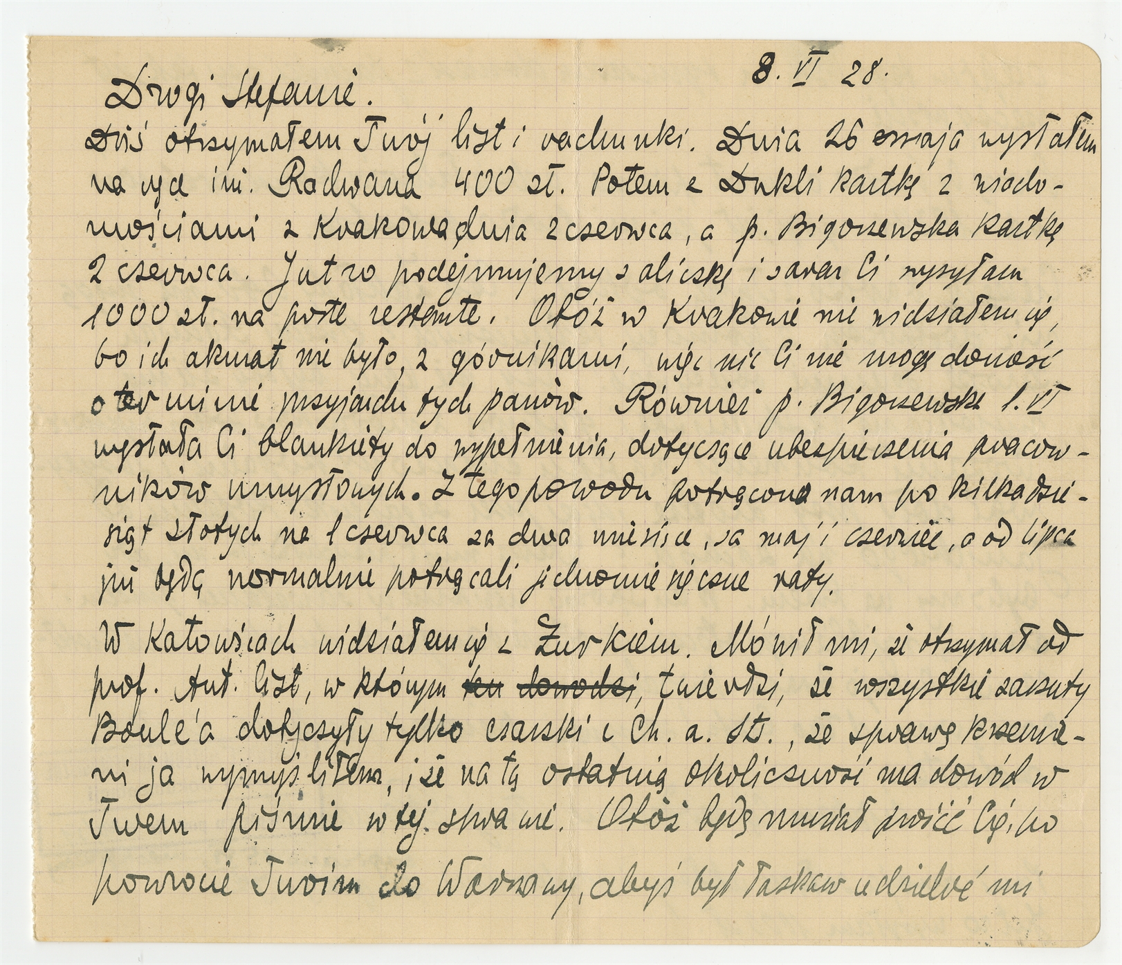 Rękopis - list Romana Jakimowicza do Stefana Krukowskiego z dnia 8 VI [19]28 roku
