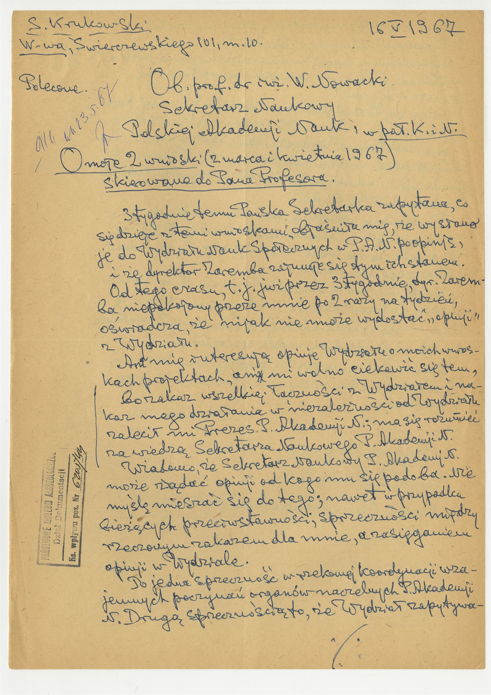 Rękopis - list S. Krukowskiego do W. Nowackiego Sekretarza Naukowego PAN z dn. 16 V 1967 r.