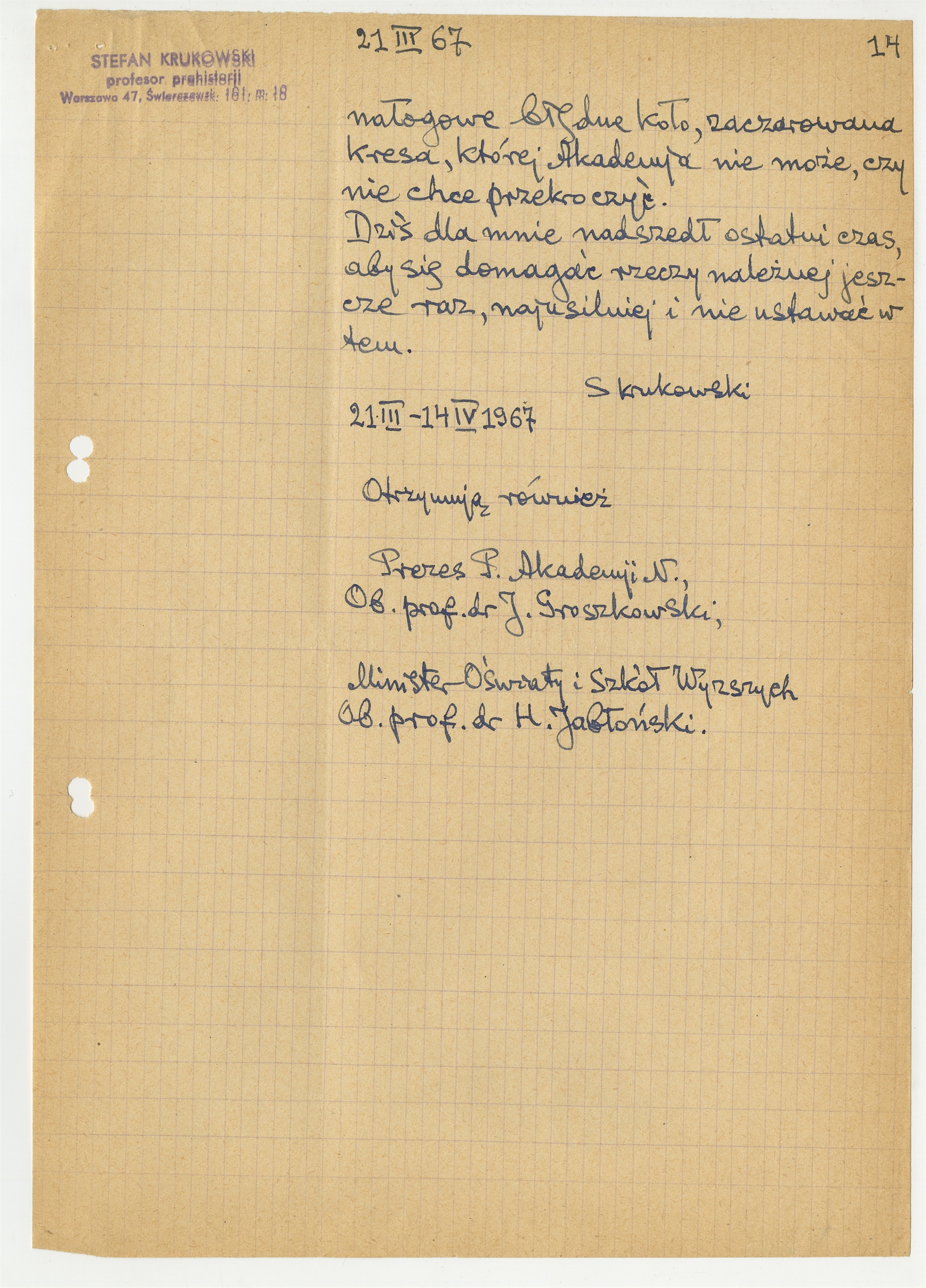 Rękopis - list S. Krukowskiego do W. Nowackiego Sekretarza Naukowego PAN z dn. 21 III 1967 r. Strona 14