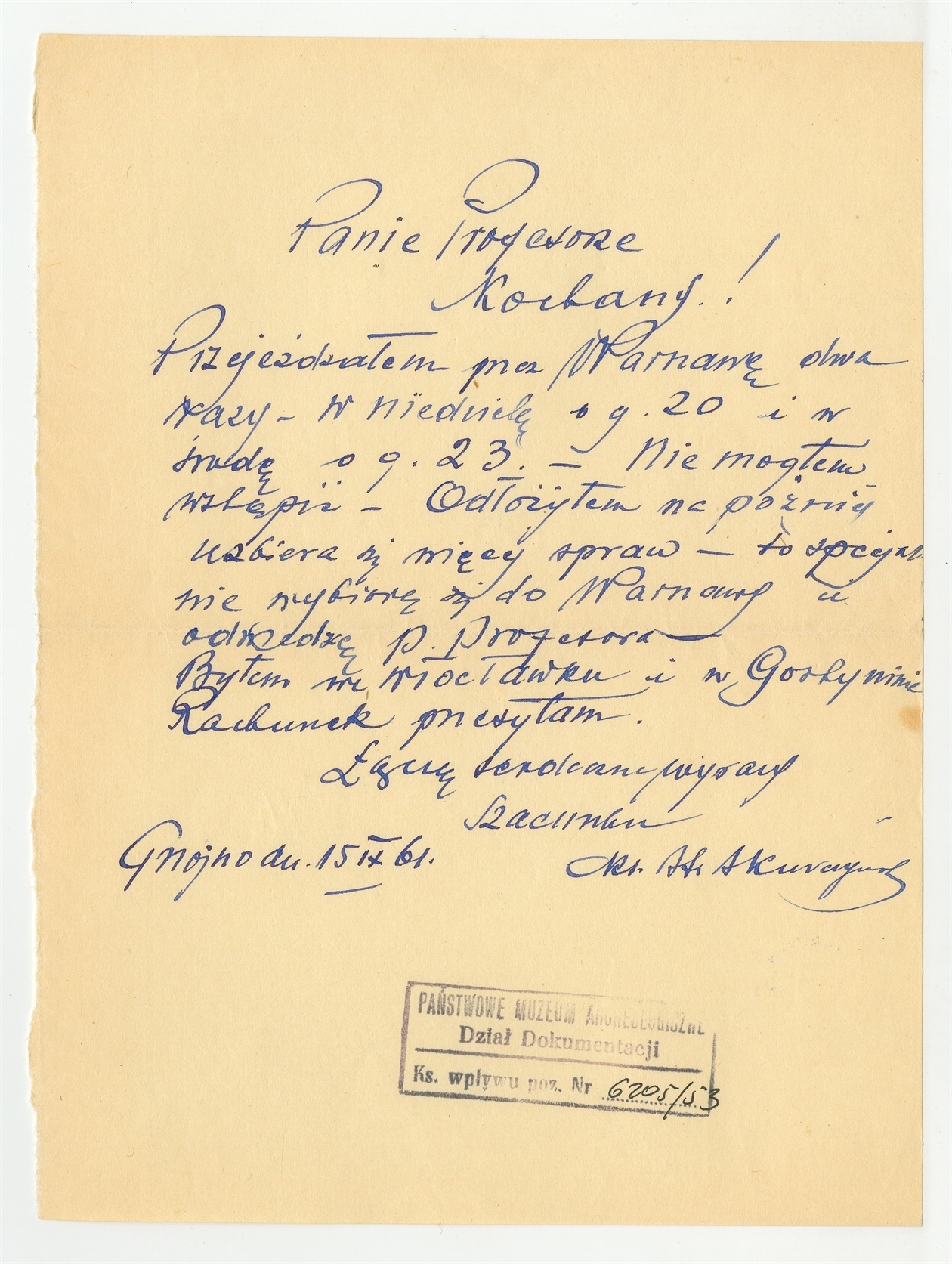 Rękopis - list Stanisława Skurczyńskiego do Stefana Krukowskiego z dnia 15 IX [19]61 roku