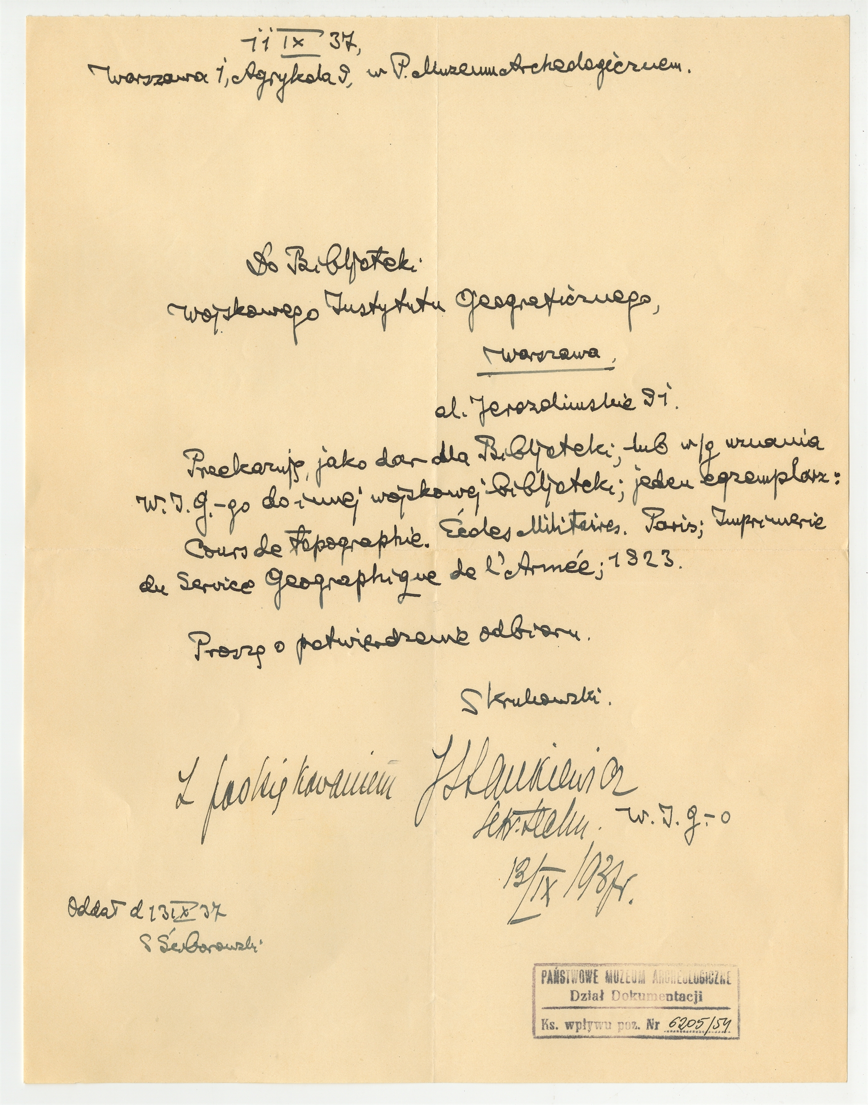 Rękopis - list Stefana Krukowskiego do Biblioteki Wojskowego Instytutu Geograficznego z dnia 11 IX [19]37 roku