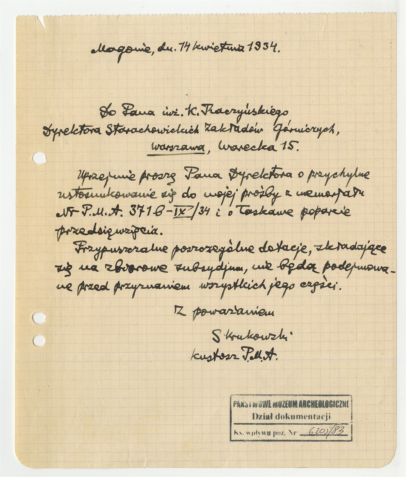 Rękopis - list Stefana Krukowskiego do K. Raczyńskiego z dnia 14 kwietnia 1934 roku