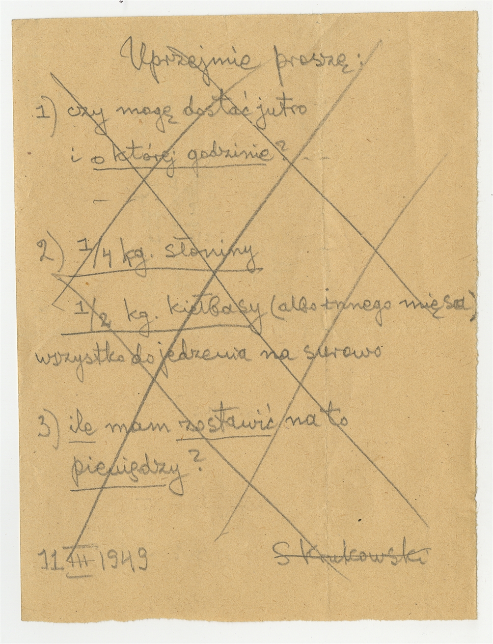 Rękopis - list Stefana Krukowskiego do NN z dnia 11 II 1949 roku w sprawie zakupów spożywczych