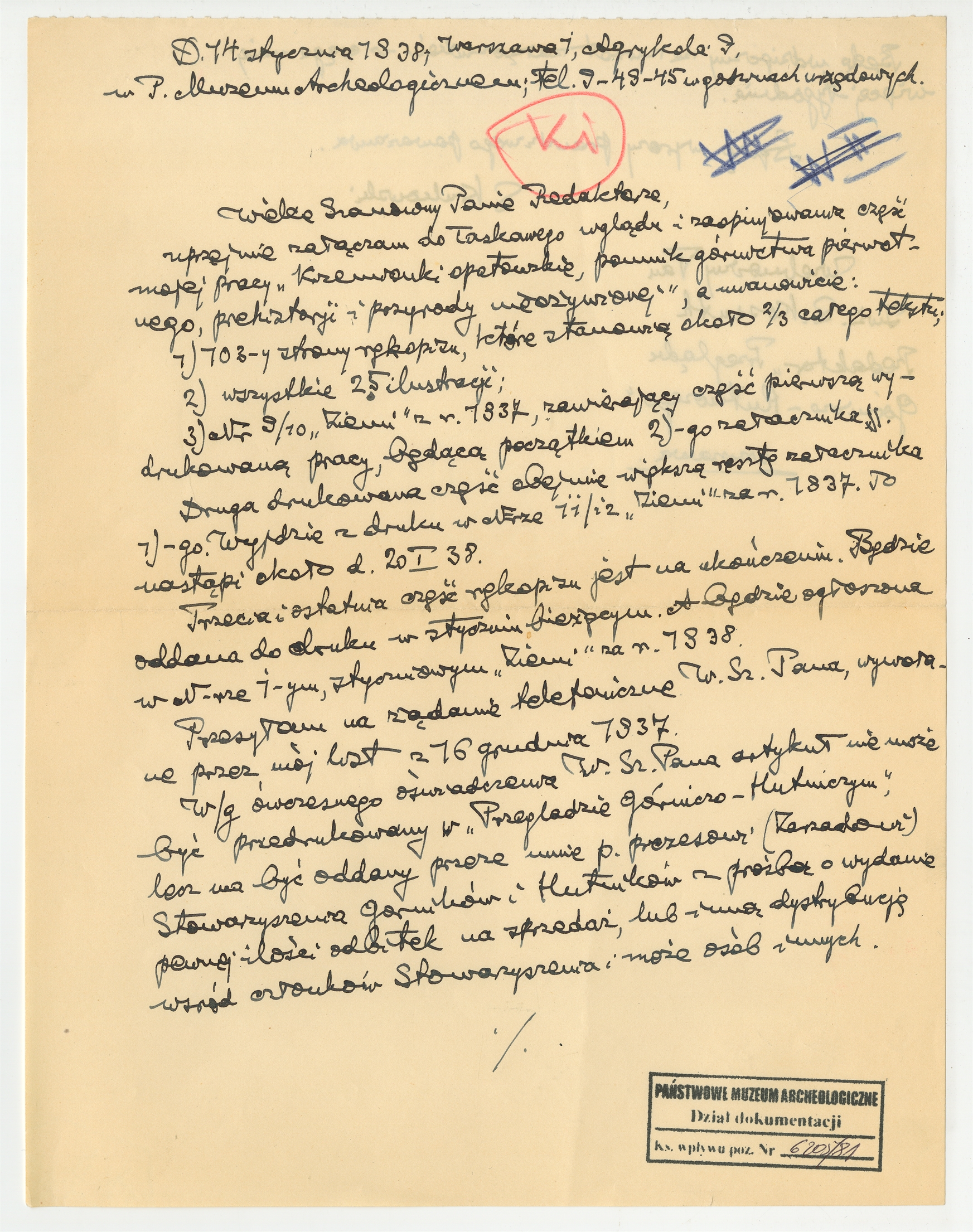Rękopis - list Stefana Krukowskiego do S. Kossutha z dnia 14 stycznia 1938 roku