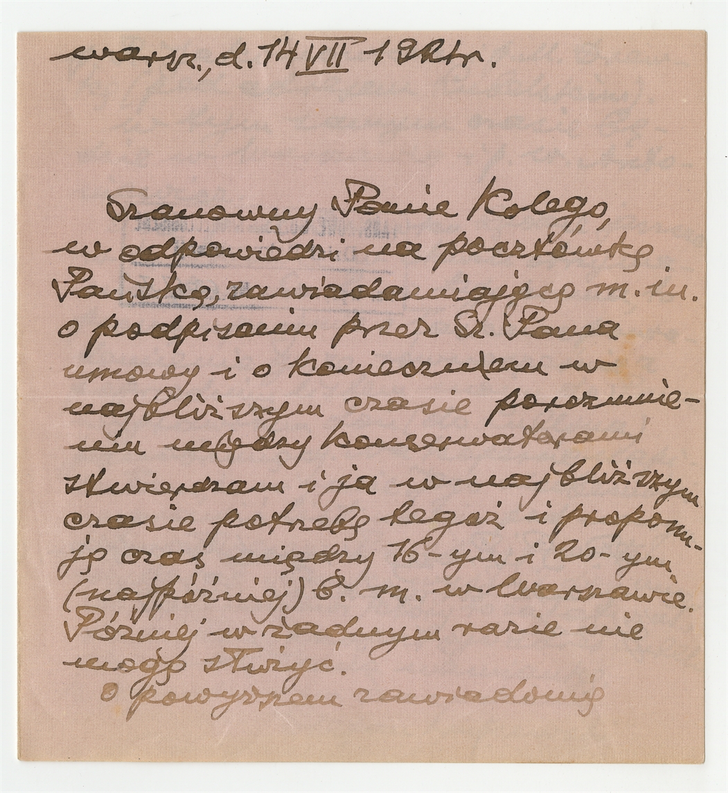 Rękopis - list Stefana Krukowskiego z dnia 14 VII 1921 roku do NN