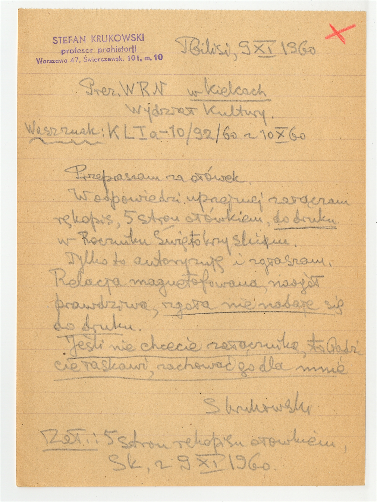 Rękopis - list Stefana Krukowskiego z dnia 9 XI 1960 roku do Prezesa WRN w Kielcach