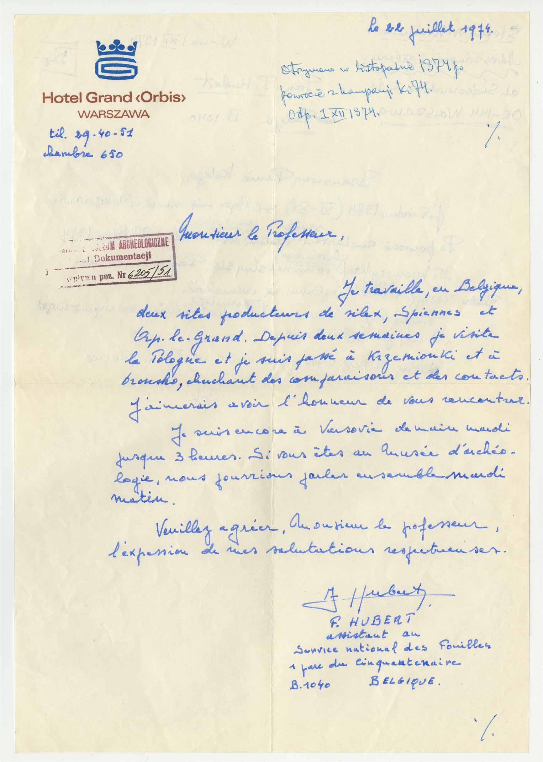 Rękopis - list w języku francuskim P. Huberta do Stefana Krukowskiego z dnia 22 lipca 1974 roku