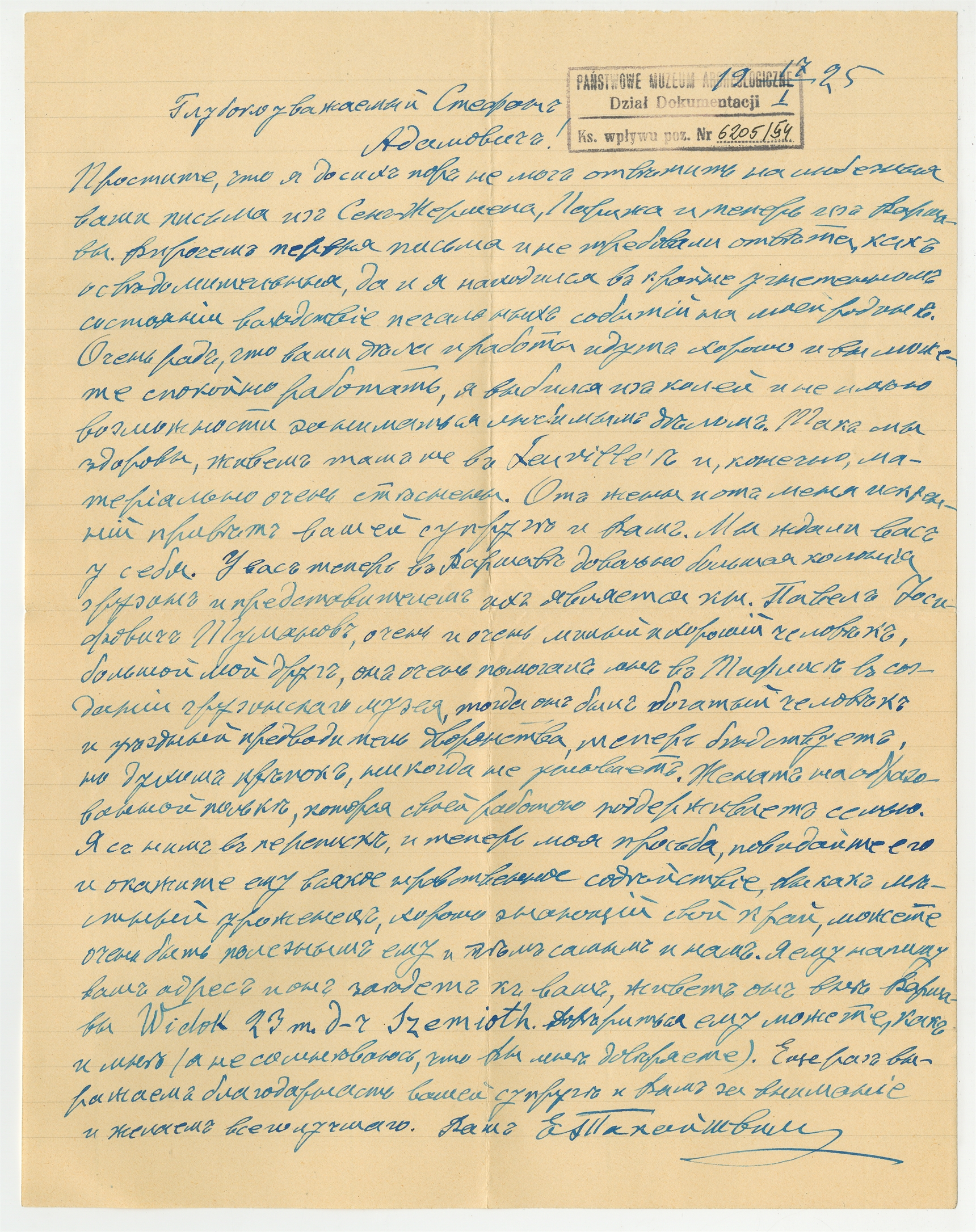 Rękopis - list w języku rosyjskim E. Takaiszwilego do Stefana Krukowskiego z dnia 17 I 1925 roku
