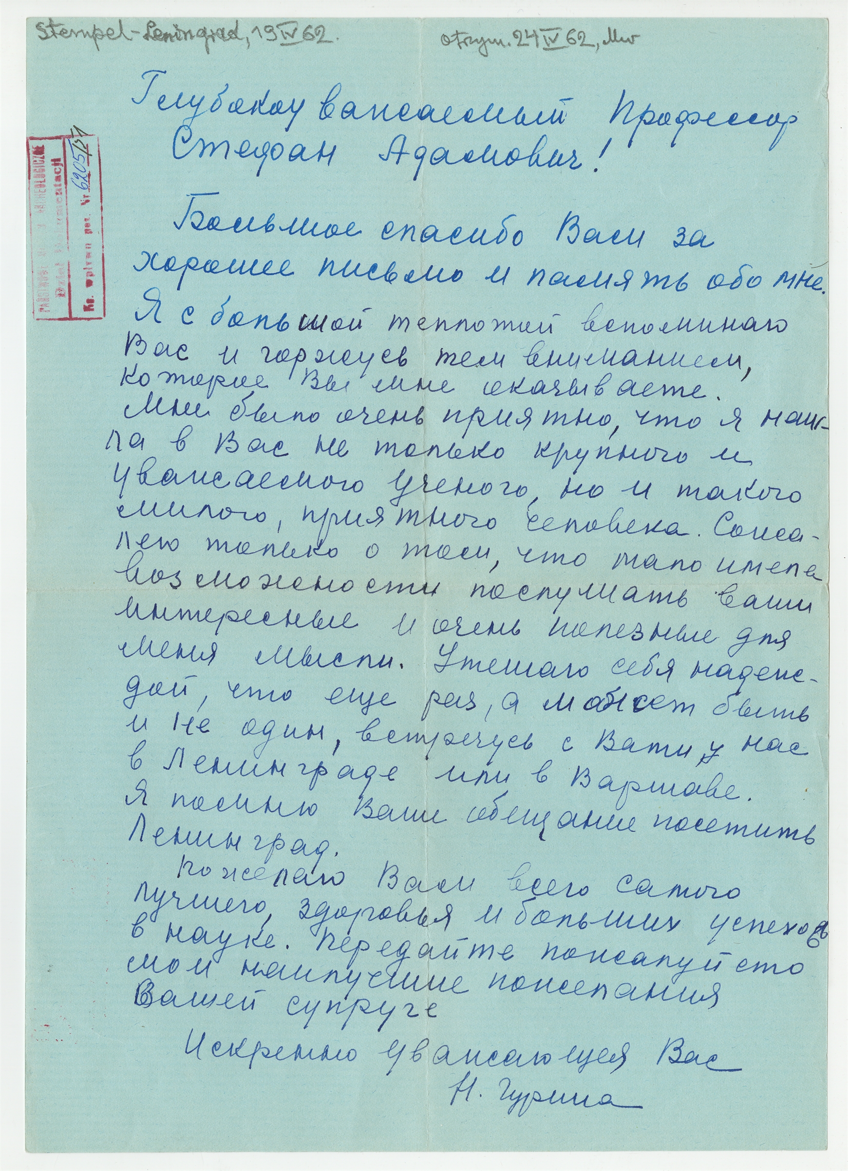 Rękopis - list w języku rosyjskim Niny Guriny do Stefana Krukowskiego z dnia 19 IV [19]62 roku