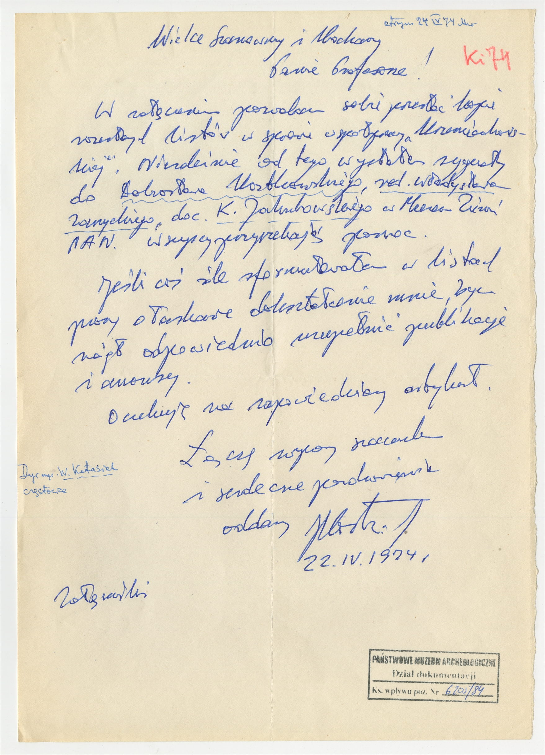 Rękopis - list W. Kotasiaka do Stefana Krukowskiego z dnia 22 IV 1974 roku