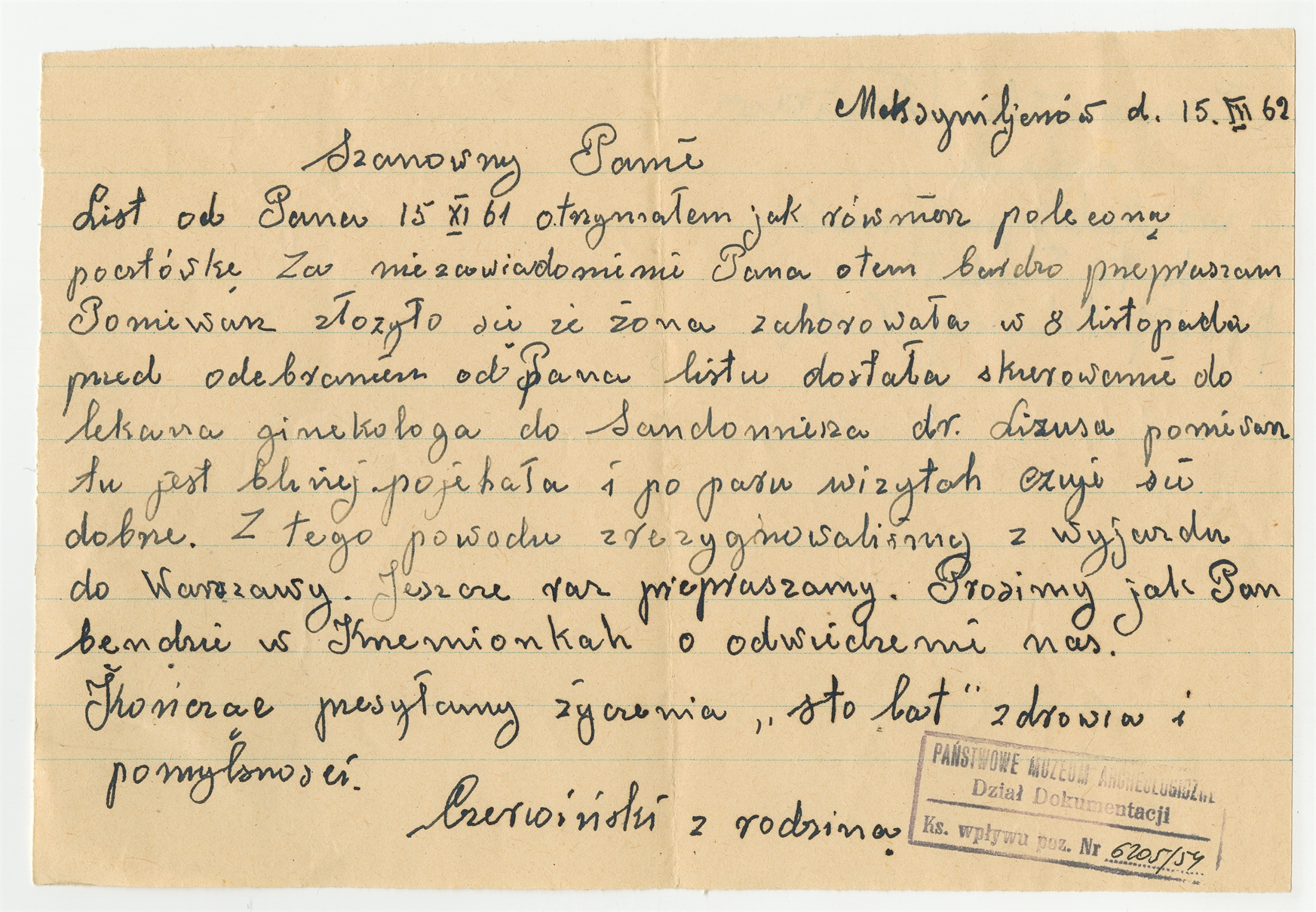 Rękopis - list Wacława Czerwińskiego do Stefana Krukowskiego z dnia 15 III [19]62 roku.