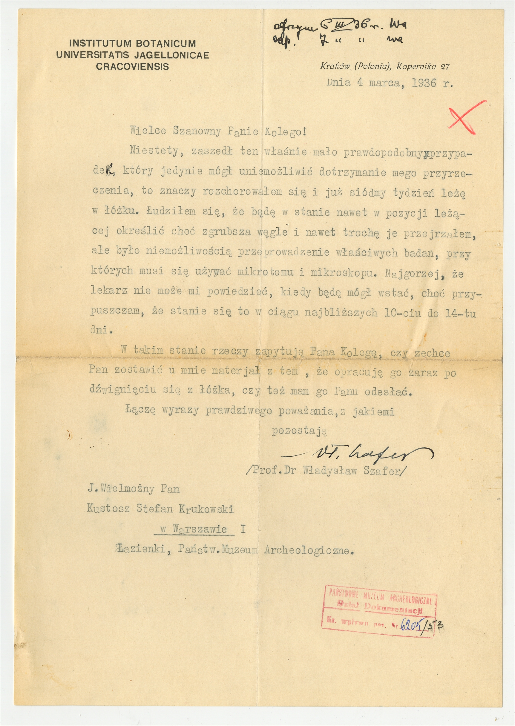 Rękopis - list Władysława Szafera do Stefana Krukowskiego z dnia 4 marca 1936 roku.