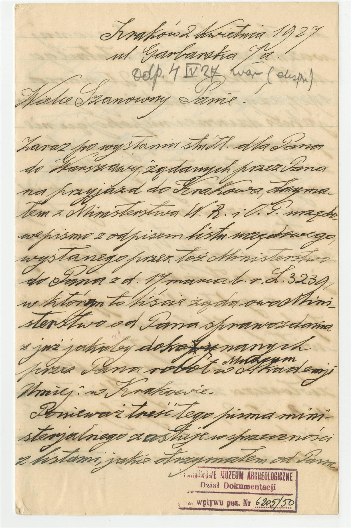 Rękopis - list Włodzimierza Demetrykiewicza do Stefana Krukowskiego z dn. 2 IV 1927 r.