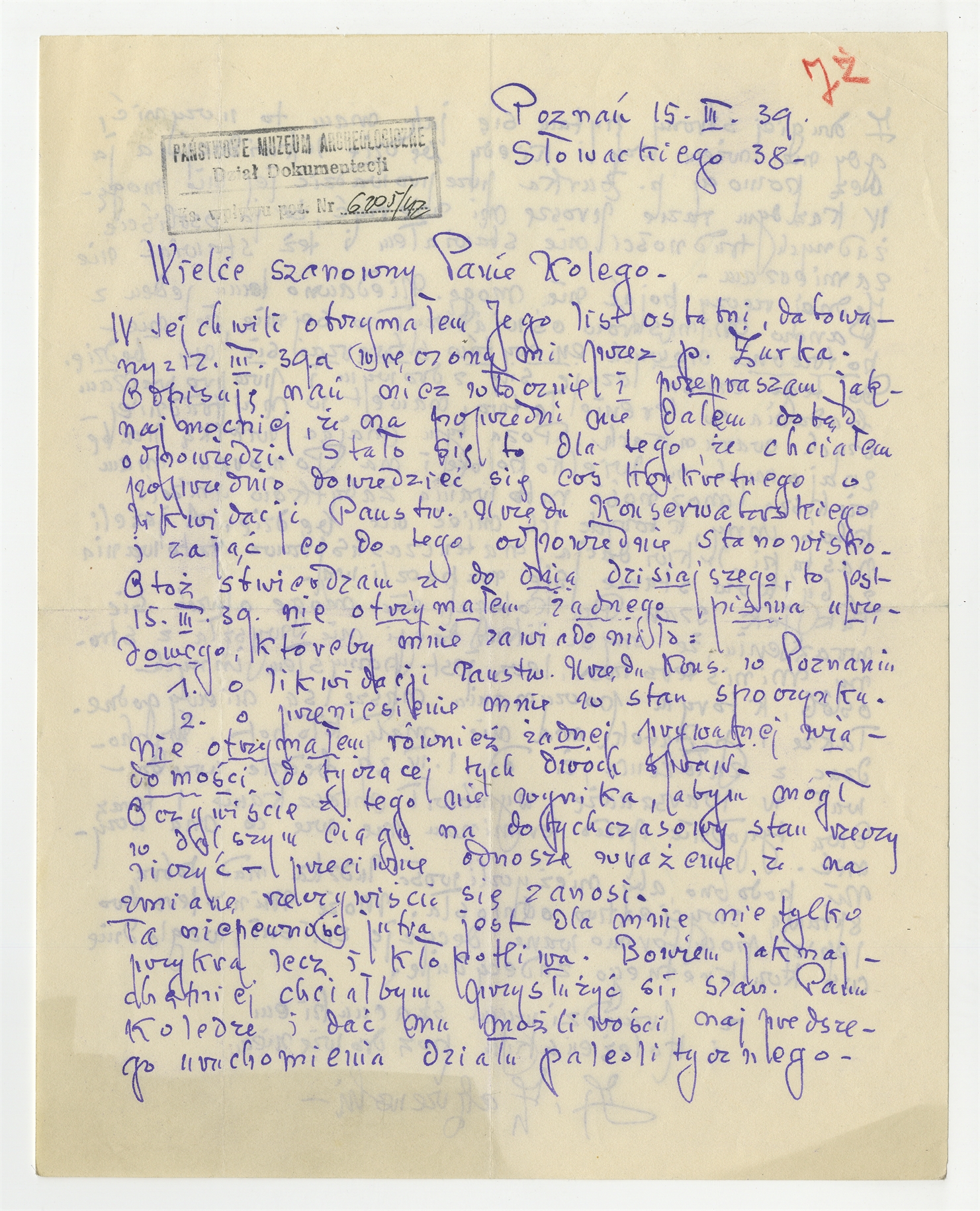 Rękopis - list Z. Zakrzewskiego do Stefana Krukowskiego z dnia 15 III [19]39 roku