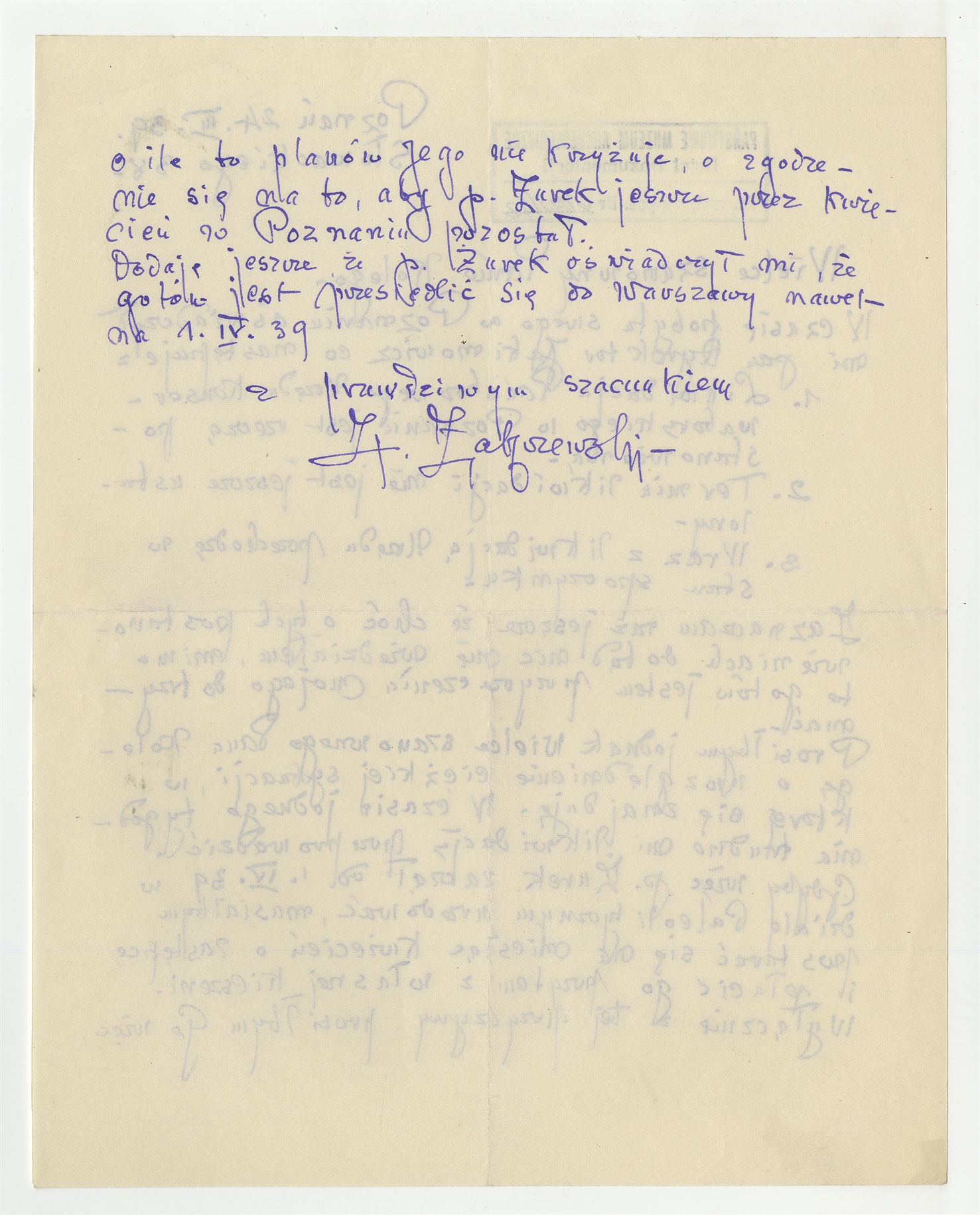 Rękopis - list Z. Zakrzewskiego do Stefana Krukowskiego z dnia 24 III [19]39 roku (cd)