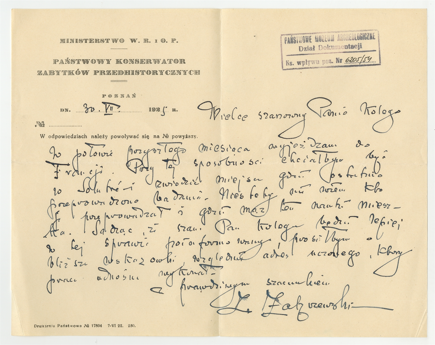 Rękopis - list Z. Zakrzewskiego do Stefana Krukowskiego z dnia 30 VII 1925 roku