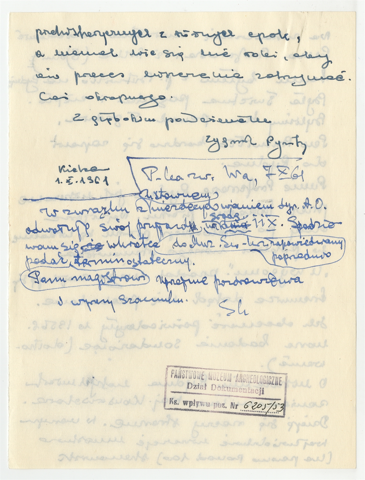 Rękopis - list Zygmunta Pyzika do Stefana Krukowskiego z dnia 1 pażdziernika 1957 roku. Rękopis - brudnopis odpowiedzi Stefana Krukowskiego z dnia 7 X [19]61 na list