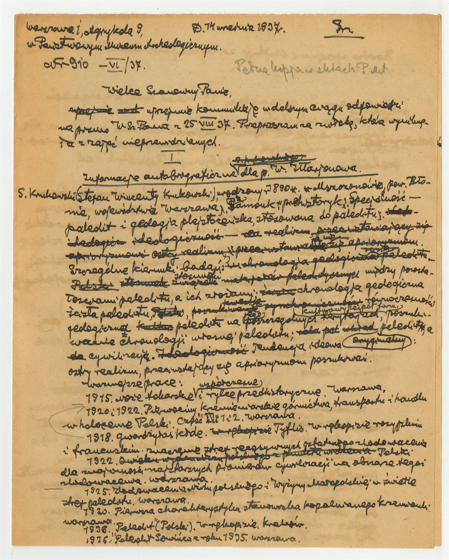 Rękopis listu - brudnopis Stefana Krukowskiego do J. Aleksandrowa Sekretarza Ambasady ZSRR z dn. 14 IX 1937 r.