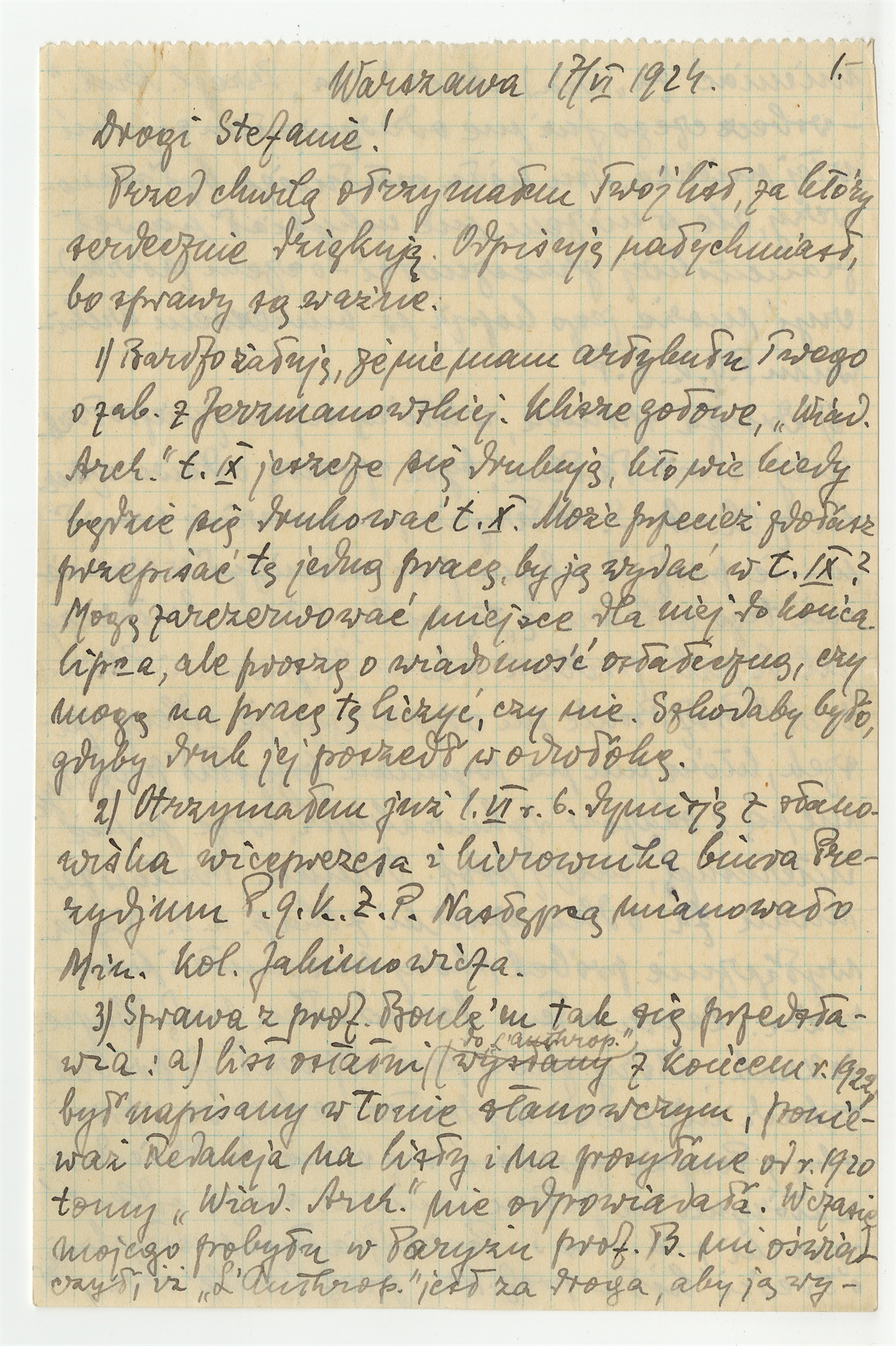 Rękopis listu do Stefana Krukowskiego z dn. 17 VI 1924 r.