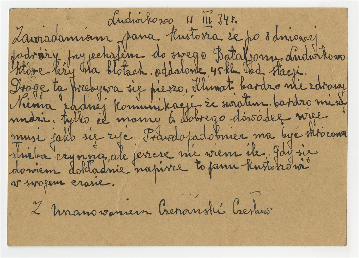 Rękopis listu (kartka pocztowa - awers) Czesława Czerwińskiego "Do Pana S. Krukowskiego Kustosza Państwowego Muzeum Archeologicznego" z dnia 11 III 1934 r.