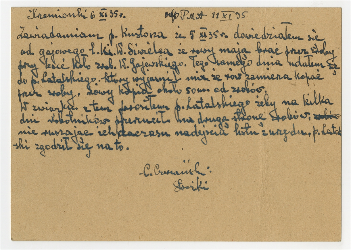 Rękopis listu (kartka pocztowa - awers) "Do Pana S. Krukowskiego Kustosza P. Muzeum Archeolog. ..." z dnia 6 XI [19]35 r.