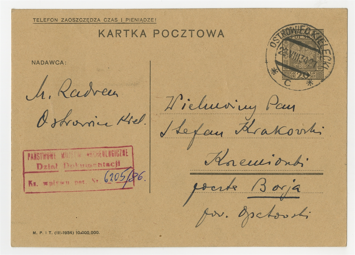 Rękopis listu (kartka pocztowa - awers) M. Radwana do Stefana Krukowskiego dn. 28 VIII [19]34 r.