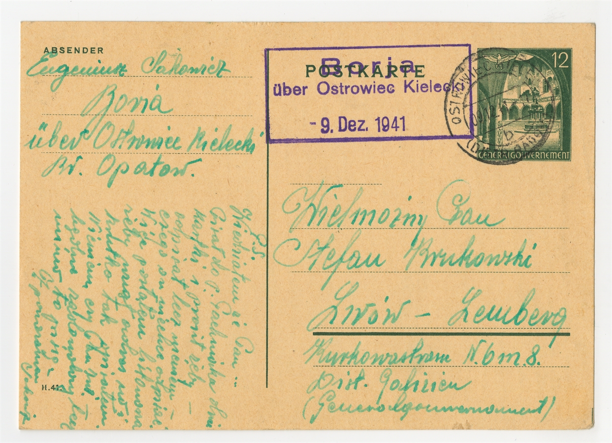 Rękopis listu (kartka pocztowa - rewers) adresowana do Stefana Krukowskiego napisana przez Eugeniusza Sakowicza [?]. Data stempla -9.12.1941