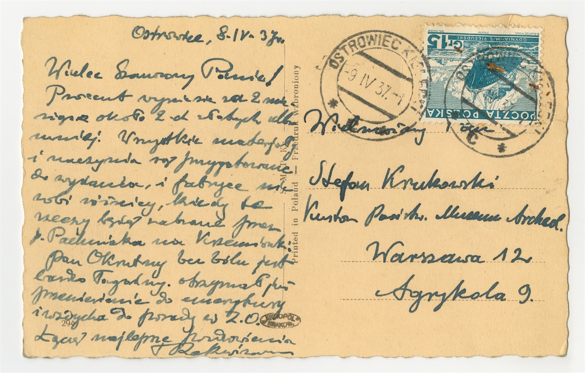 Rękopis listu (kartka pocztowa-rewers) adresowana do Stefana Krukowskiego z dnia 8 IV [19]37 r.
