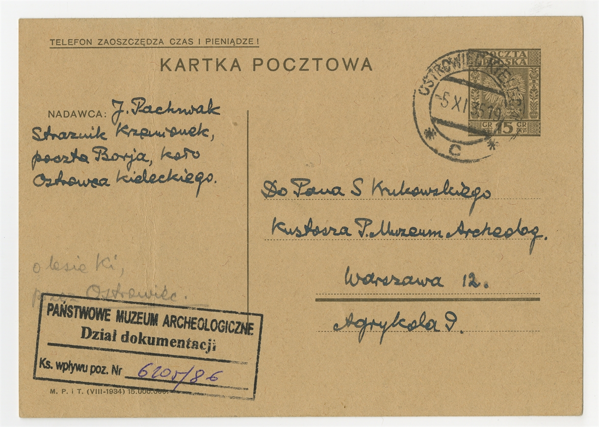 Rękopis listu (kartka pocztowa - rewers) "Do Pana S. Krukowskiego Kustosza P. Muzeum Archeolog. ..." z dnia 6 XI [19]35 r.