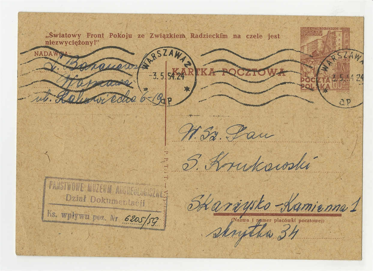 Rękopis listu L. Baranowskiego (na karcie pocztowej) do Stefana Krukowskiego Warszawa 2 V [19]54 r. - strona 1: awers