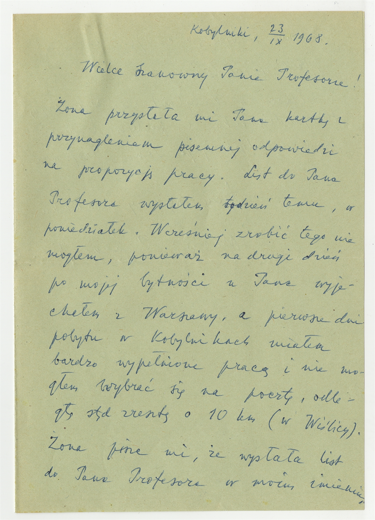 Rękopis listu Macieja Czarneckiego do profesora Stefana Krukowskiego wysłany dn. 23 IX 1968 roku z miejscowości Kobylniki w sprawie propozycji pracy - strona 1: zatytułowana "Wielce Szanowny Panie Profesorze"