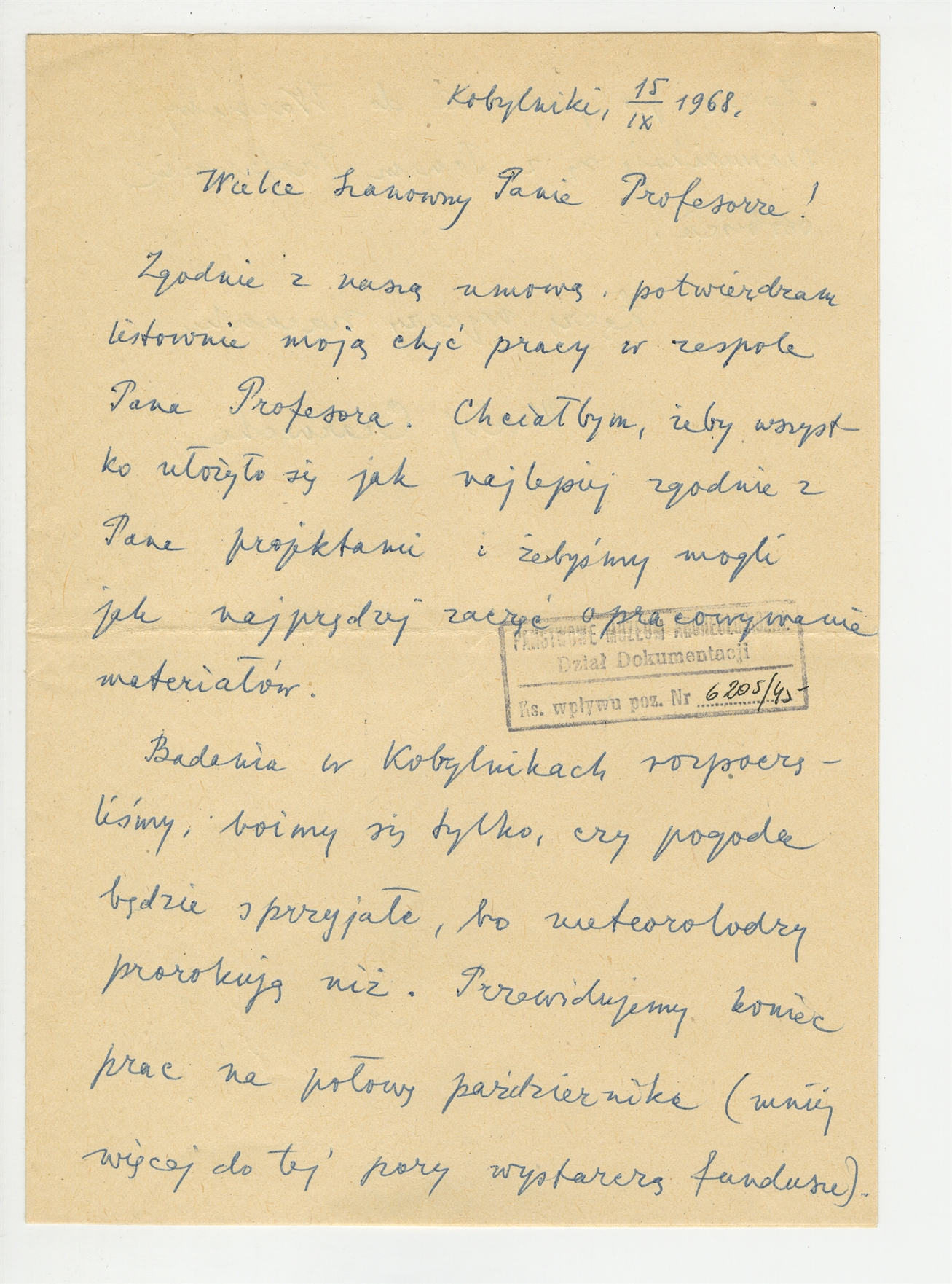 Rękopis listu Macieja Czarneckiego do S. Krukowskiego w sprawie pracy w zespole oraz badań w Kobylnikach - strona 1: zatytułowana "Wielce Szanowny Panie Profesorze" "Zgodnie z naszą umową" … "wystarczą fundusze" Kobylniki 15 IX 1968 (bez numeru strony)