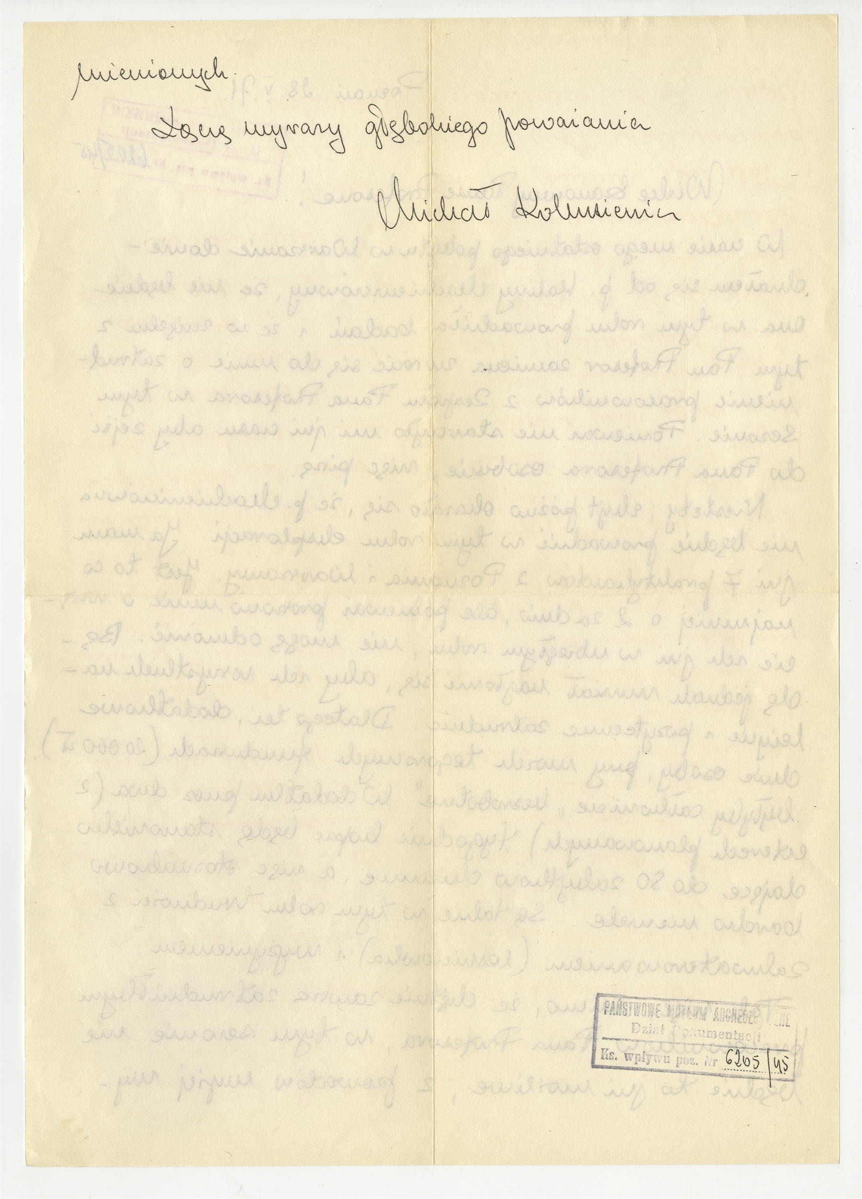 Rękopis listu Michała Kobusiewicza do S. Krukowskiego w sprawie zatrudnienia pracowników Zespołu - strona 2: "-mienionych" … "Michał Koluniewicz" (bez numeru strony)