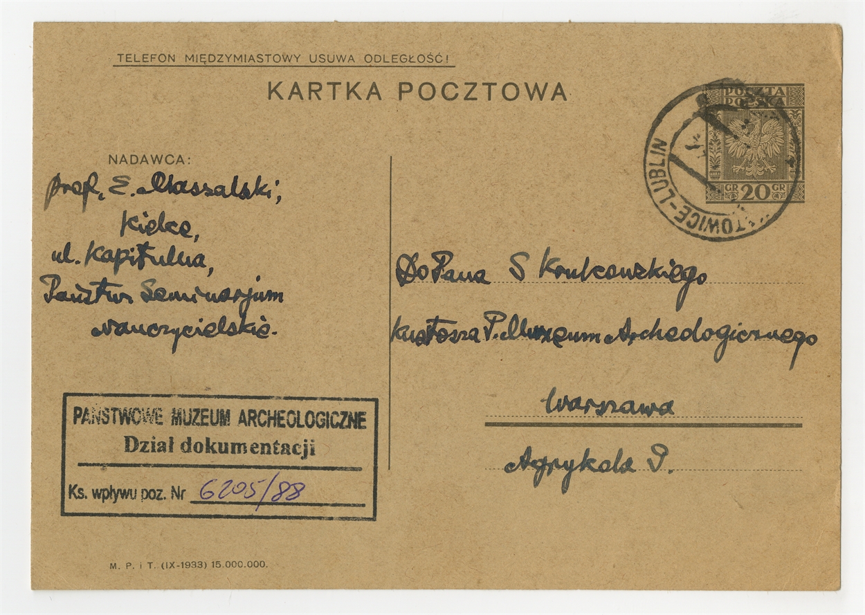 Rękopis listu na karcie pocztowej prof. E. Massalskiego do Stefana Krukowskiegona na temat memoriału w sprawie inwestycji w Krzemionkach Kielce 24 maja 1934 r. - rewers: dane adresowe nadawcy i adresata