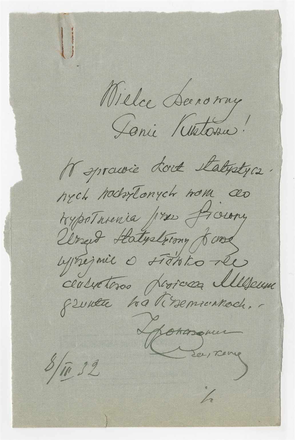 Rękopis listu NN do "Wielce Szanownego Pana Kustosza" z dnia 8 III [19]32 r.