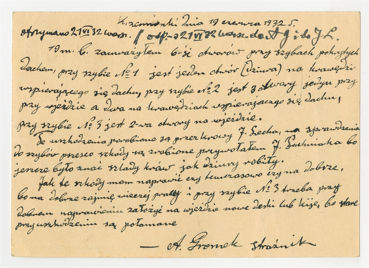 Rękopis listu (pocztówka-awers) A. Gromka "Do Pana S. Krukowskiego Kustosza Państwowego Muzeum Archeologicznego" z dnia 19 czerwca 1932 r.