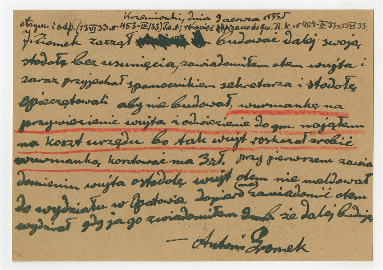 Rękopis listu (pocztówka-awers) A. Gromka "Do Pana S. Krukowskiego Kustosza Państwowego Muzeum Archeologicznego" z dnia 9 czerwca 1933 r.