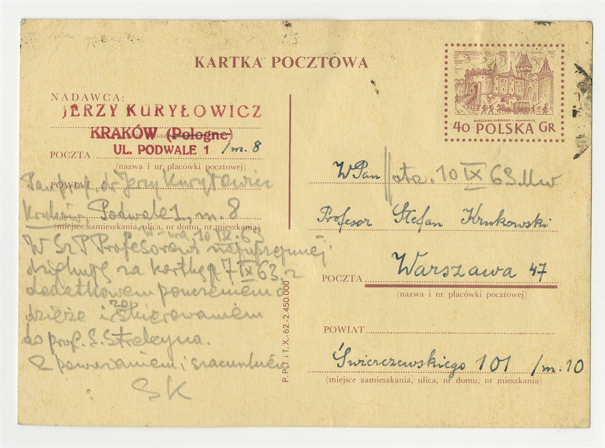 Rękopis listu prof. Jerzego Kuryłowicza do prof. S. Krukowskiego na karcie pocztowej w sprawie etymologii słowa "dzieha" oraz wspólnego określenia językowego na "sierp" i żuchwę" Kraków 7 IX 1963 - rewers: adres nadawcy i adresata oraz brudnopis odpowiedzi S. Krukowskiego na list J. Kuryłowicza