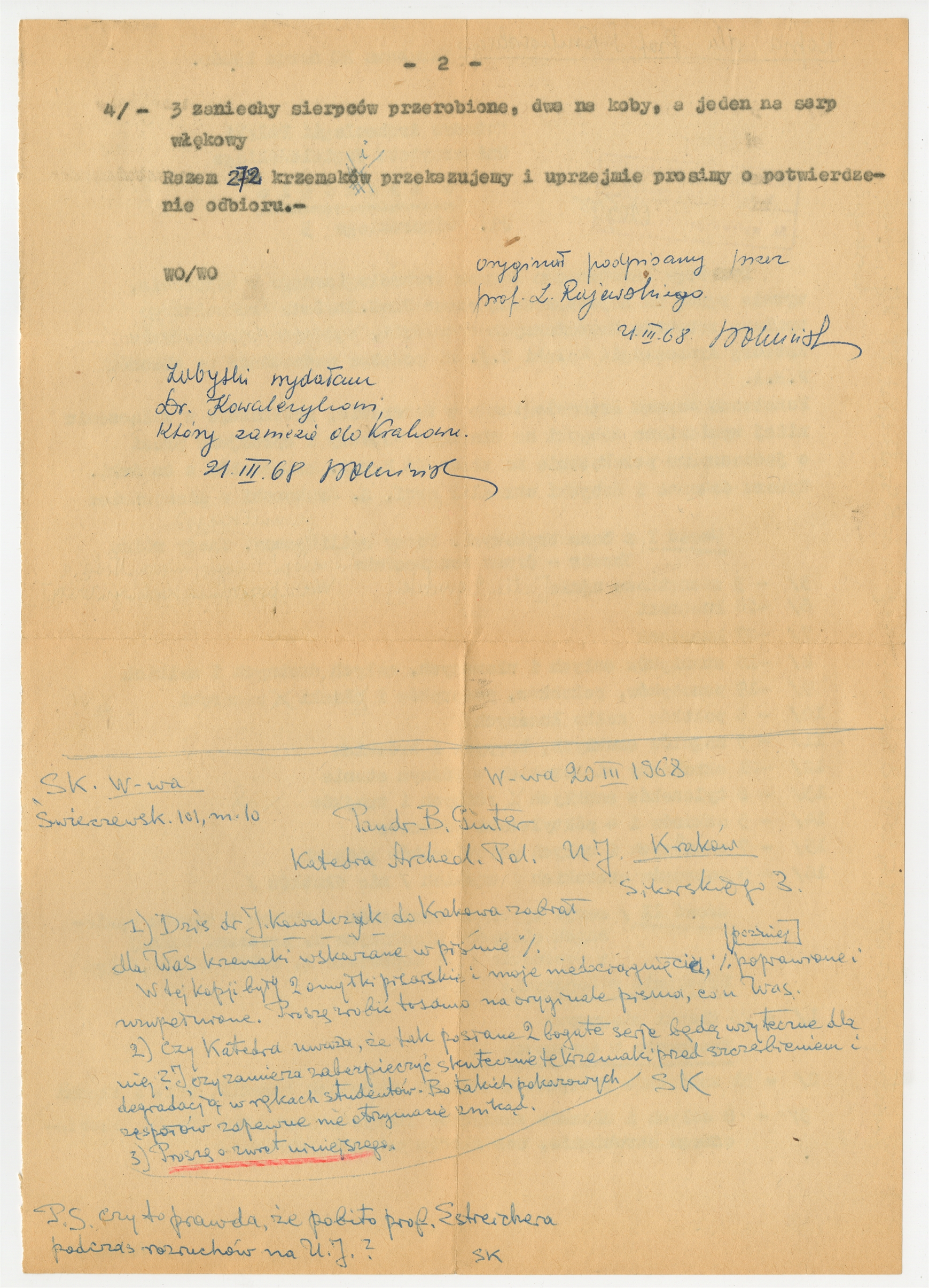 Rękopis listu prof. Stefana Krukowskiego do dr Bolesława Gintera z dnia 20 III 1968 r. wraz z załącznikiem ( kopia części pisma do Katedry Archeologii Polski Uniwersytetu Jagielońskiego w Krakowie)