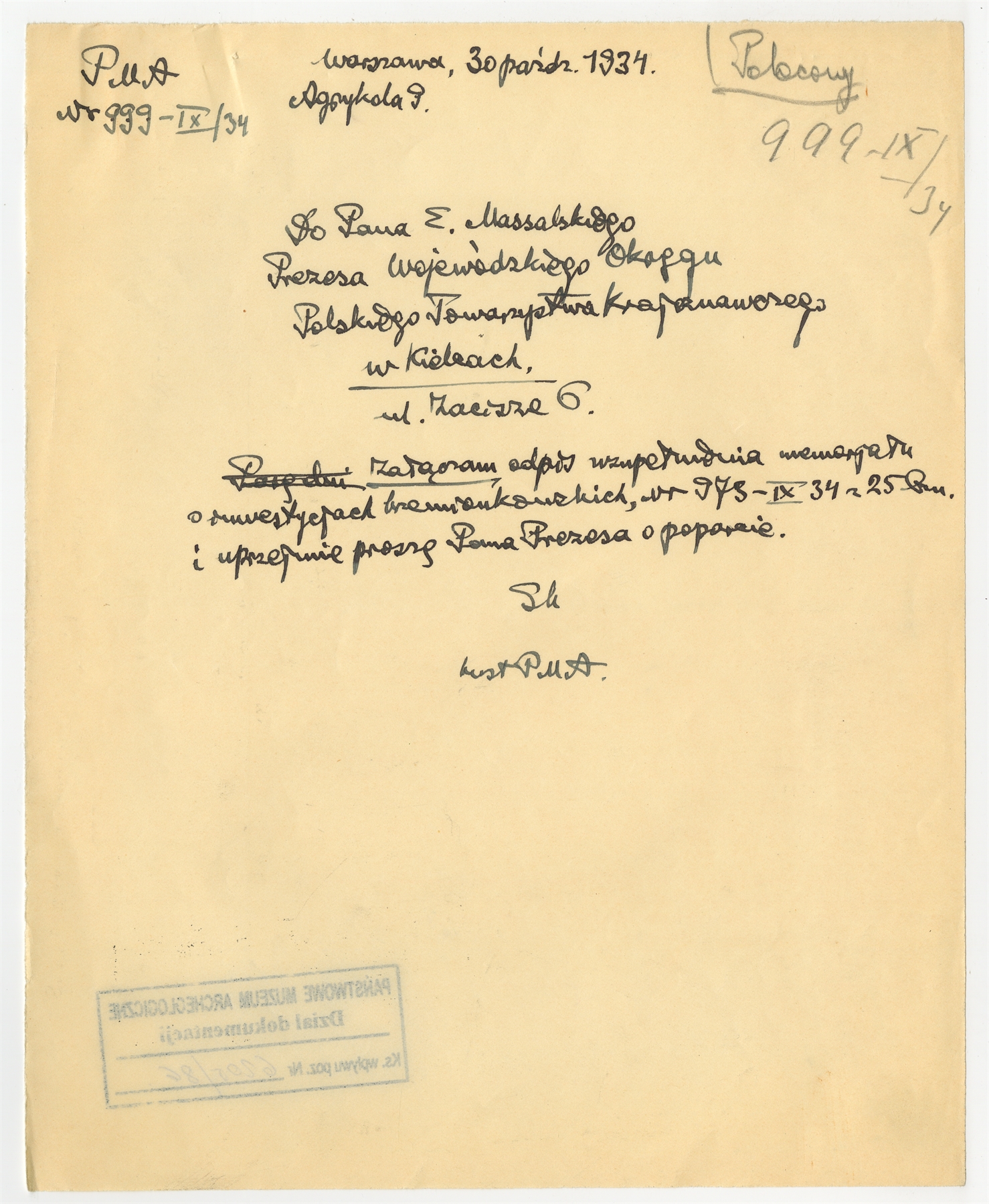 Rękopis listu prof. Stefana Krukowskiego do E. Massalskiego Prezesa Wojewódzkiego Okręgu Polskiego Towarzystwa Krajoznawczego w Kielcach z dn. 30 pażdziernika 1934 r.