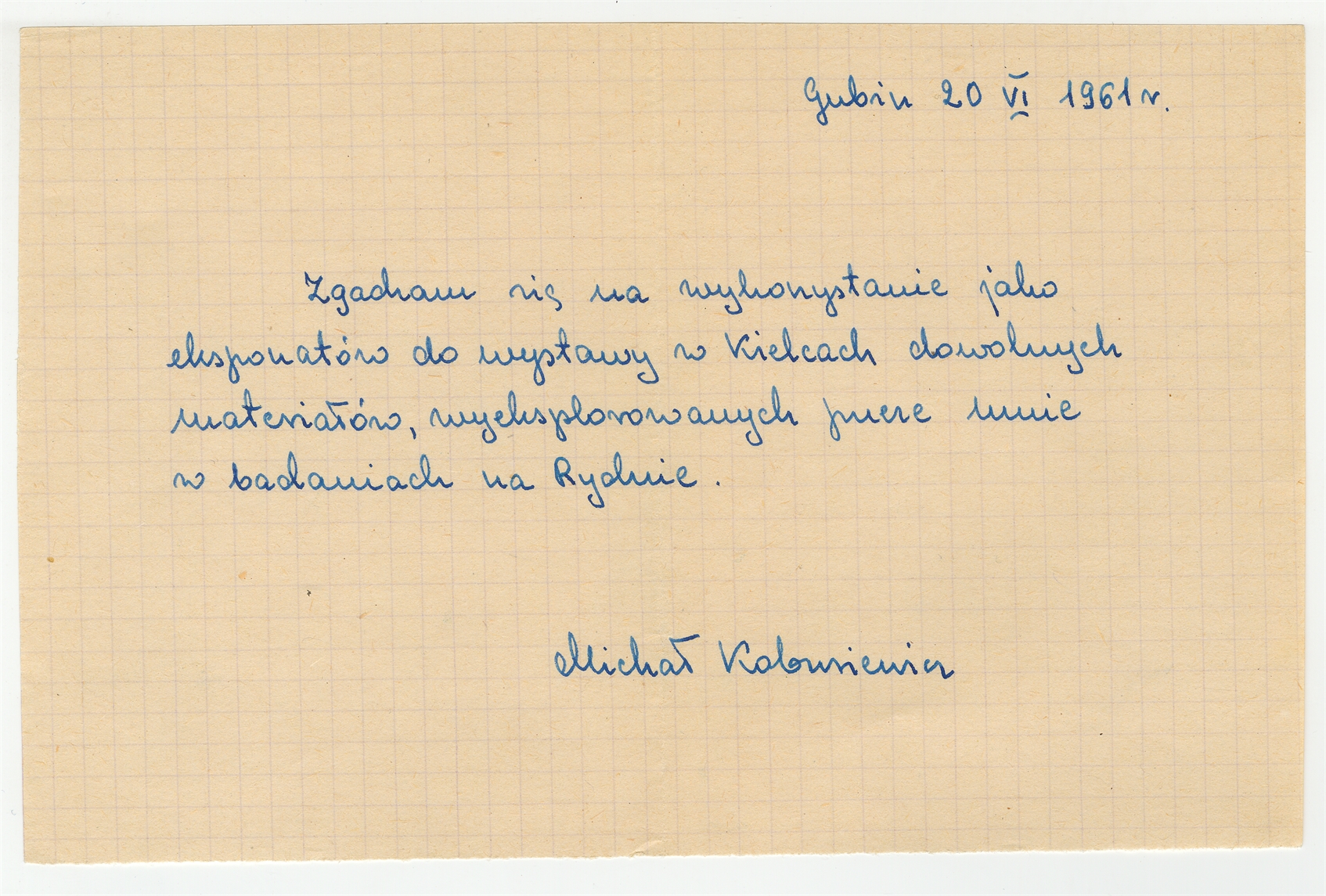 Rękopis Michała Kobusiewicza z dnia 20 VI 1961 roku zgoda na wykorzystanie materiałów