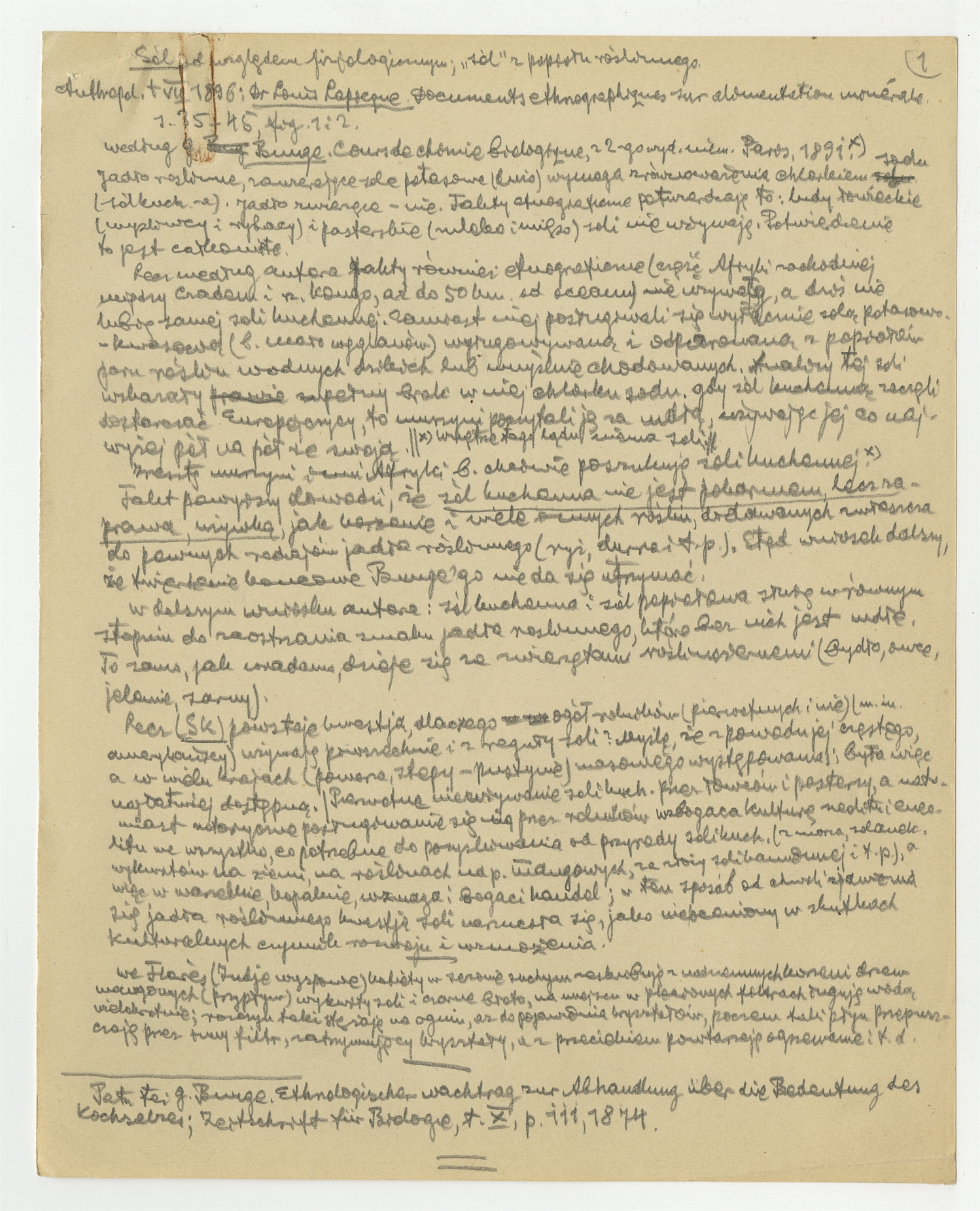 Rękopis notatek i wypisów S. Krukowskiego sporządzony z literatury na temat soli - strona 1: zatytułowana "Sól pod względem fizjologicznym; "sól" z popiołu roślinnego zawiera wypisy i notatki z publikacji "Anthrop. t. VII 1896; Dr Louis Lapsegne. Documents ethnographiques sur …" s. 35-45 fig. 1 i 2" (autorska strona 1)