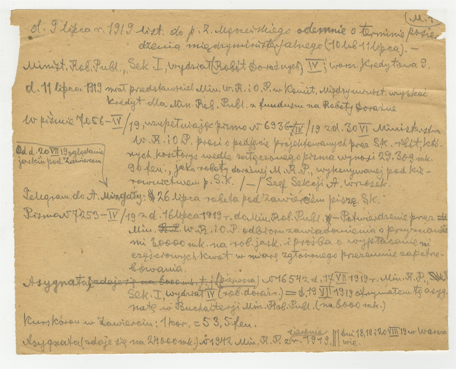 Rękopis notatek S. Krukowskiego dotyczących różnych spraw administracyjnych - strona 1: "d. 9 lipca 1919 list do" … "Dni 18 19 i 20 VIII 19 w Warszawie" (autorska strona M.1.)