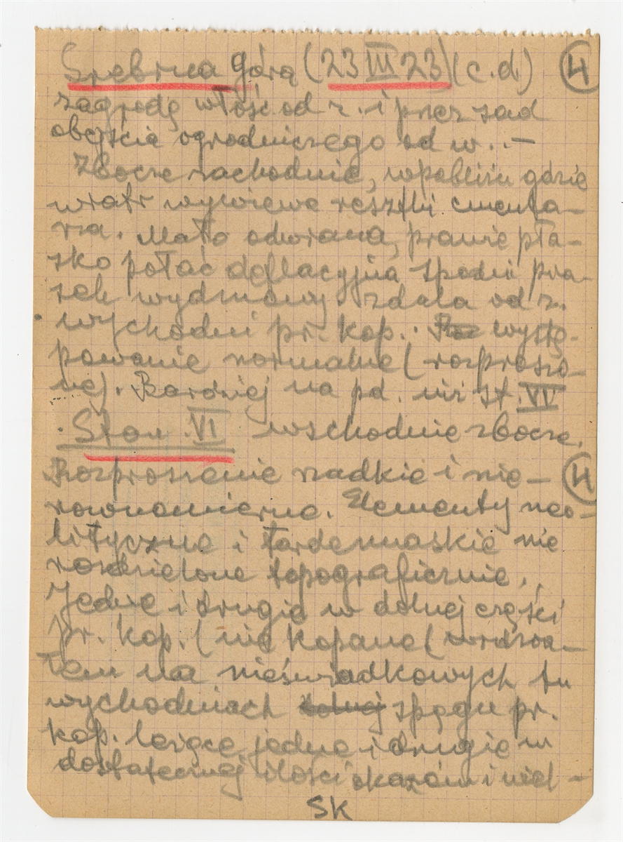 Rękopis notatek S. Krukowskiego nt. stanowiska archeologicznego w Srebrnej Górze (Warszawa-Wiśniewo - Praga Płn.) sporządzonych na luźnych kartkach pochodzących z notesu - strona 4: zatytułowana "Srebrna Góra (c.d.)" "zagrodę włość." … "ilości okazań i wiel-" 23 III [19]23 (autorska strona 4)
