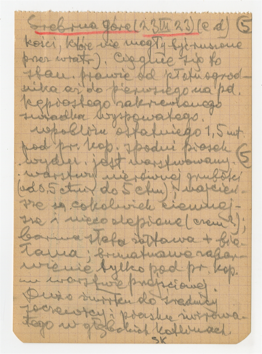 Rękopis notatek S. Krukowskiego nt. stanowiska archeologicznego w Srebrnej Górze (Warszawa-Wiśniewo - Praga Płn.) sporządzonych na luźnych kartkach pochodzących z notesu - strona 5: zatytułowana "Srebrna Góra (c.d.)" "kości któe nie mogły" … "w gbokich kotlinach" 23 III [19]23 (autorska strona 5)