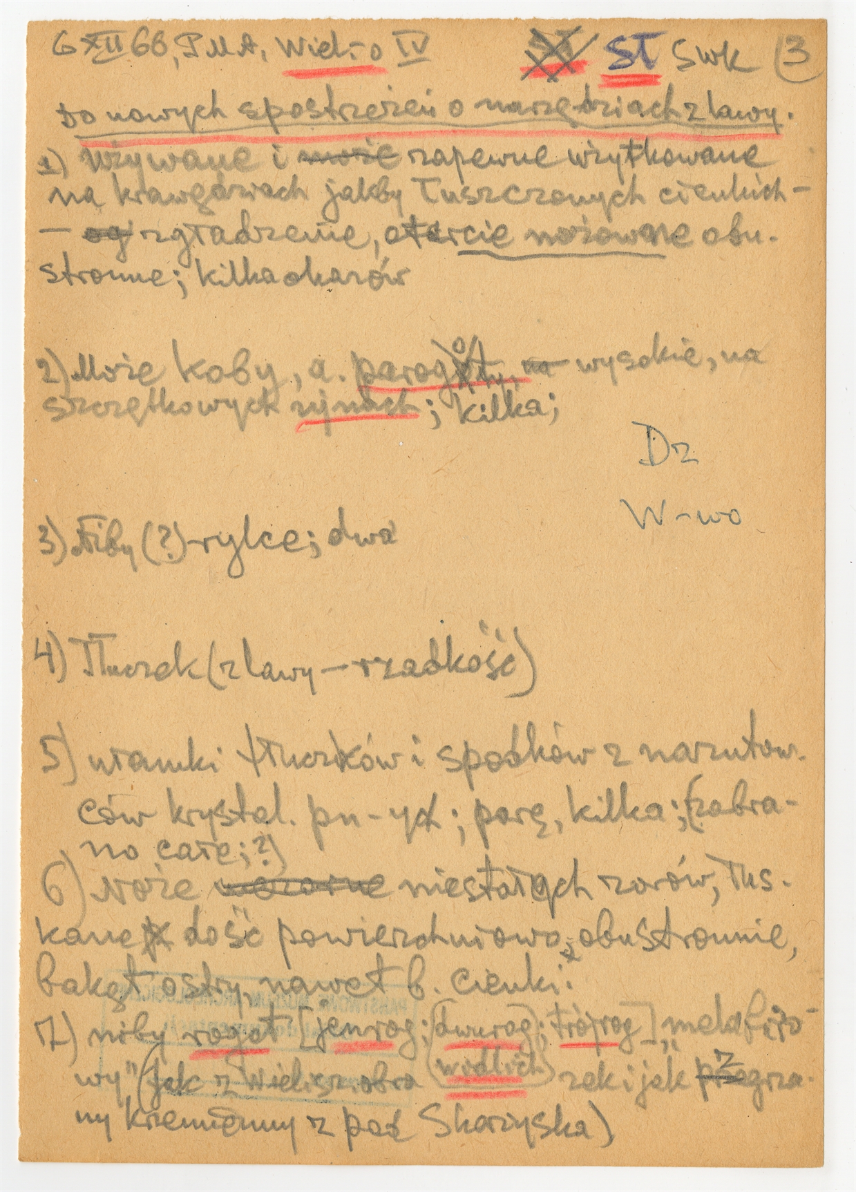 Rękopis notatek S.Krukowskiego - odpisów metryk ze stanowiska Wieliszew IV - strona 3: zatytułowana "Wiel.-o IV" - "Do nowych spostrzeżeń o narzędziach z lawy" "Używane i zapewene" … "z pod Skarżyska" 6 XII [19]66 (autorska strona 3)