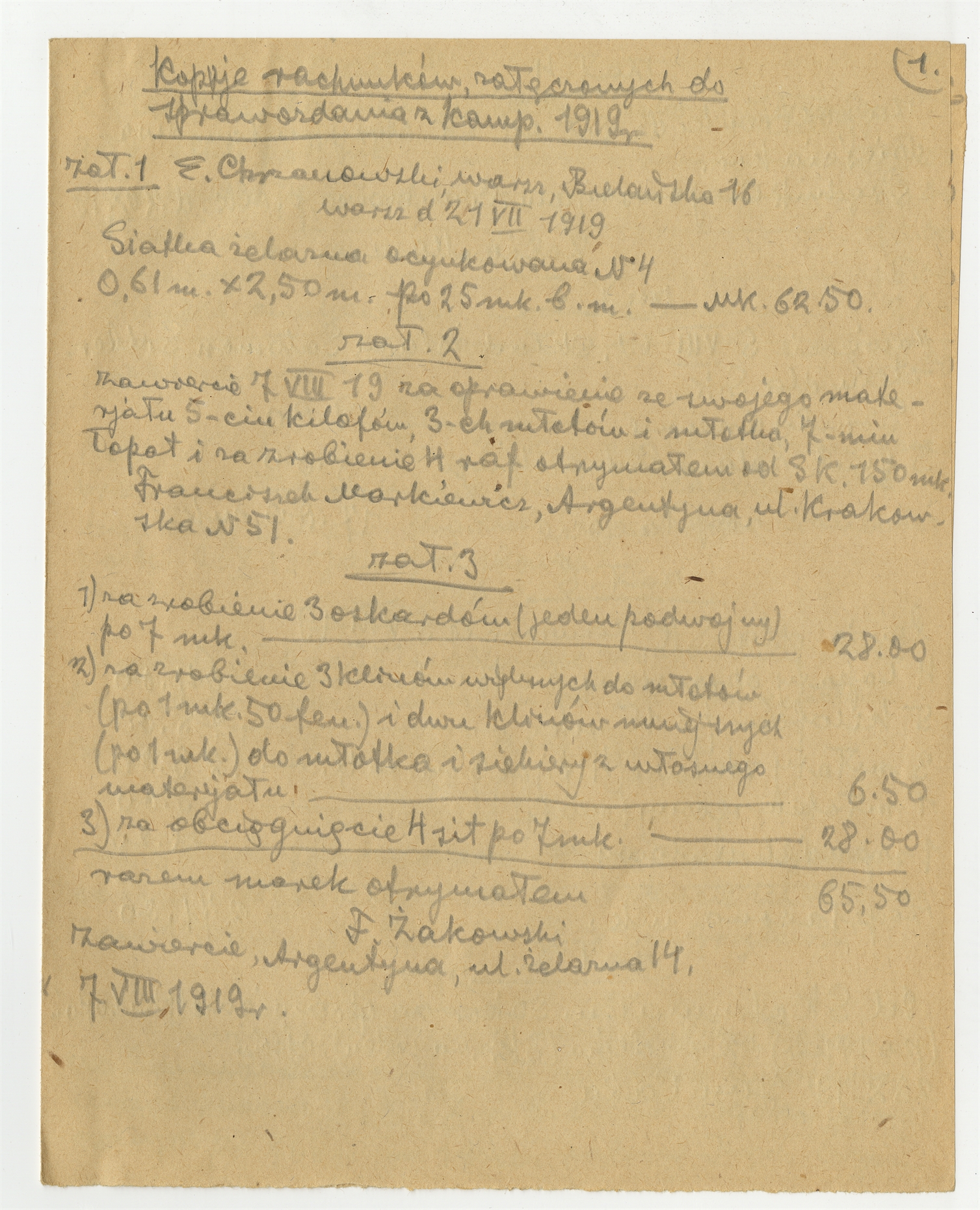 Rękopis notatek S. Krukowskiego zatytułowany "Kopje rachunków załączonych do sprawozdania z kamp. 1919 r." - strona 1: "zał. 1" … "zał. 3" (autorska strona 1)